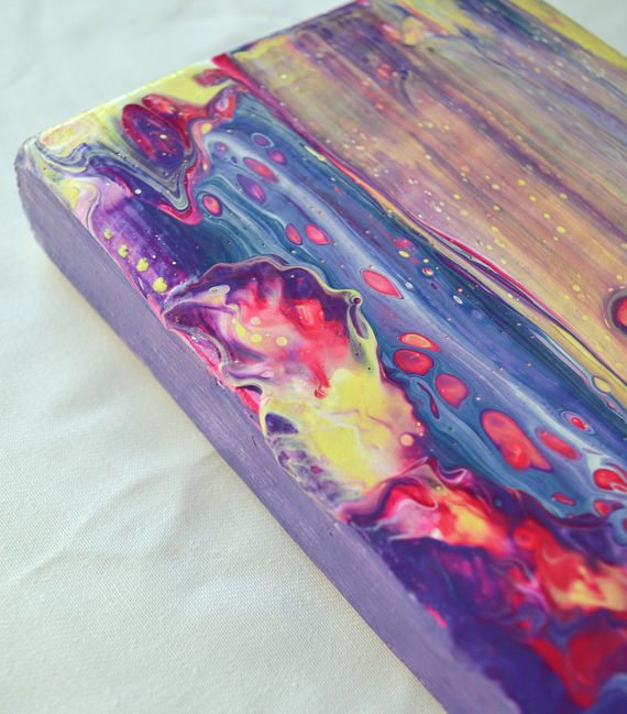 "Korallok" című modern akrilfestmény, különleges vegyes technikával, folyatásos festéssel, festőkéssel (palettakéssel) és egyéb pouring technikákkal készült. Az alap most nem vászon, hanem rusztikus újrahasznosított fa, megvilágítástól függően látszódik a fa erezete. Méretei: 14,1 cm x 27,7 cm, a vastagsága 2,3 cm. Pasztell lila, rózsaszín, sárga keveredik az erőteljesebb színekkel. Modern, absztrakt. Kicsit meseszerű, álomszerű. A lágy színek a fával kombinálva érdekes hatást érnek el. Teljesen egyedi, tökéletesen nem ismételhető meg. A festmény széle is festett, így nem szükséges kereteztetni, de természetesen lehetséges. Egy kis akasztója van hátul.
