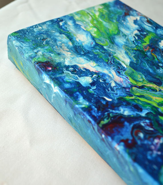 "Víz alatt" című modern akrilfestmény, különleges straw blow pouring technikával készült ezúttal újrahasznosított fára. Méretei: 13,9 x 27,5 cm, vastagsága 2,3 cm. Kékes-zöldes életteli, egyszersmind nyugtató hatású absztrakt festmény, ami igazán feldobja egy helyiség hangulatát! (Az akrilfestéknek erőteljes, szép színe van, szeretek vele dolgozni.) Kékek, zöldek, rózsaszín, barack és fehér van a képen. Teljesen egyedi, tökéletesen nem ismételhető meg. A festmény széle is festett, így nem szükséges kereteztetni, de természetesen lehetséges. Egy kis akasztója van hátul.